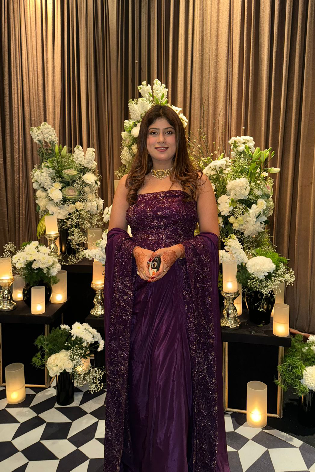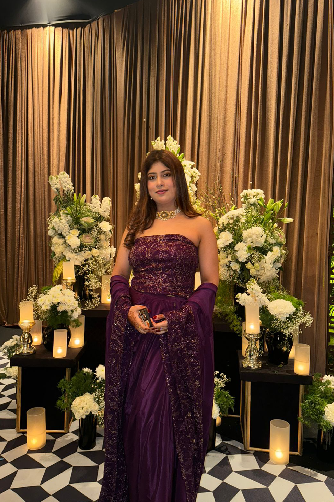 This ensemble is a three-piece set consisting of a draped skirt, embroidered corset and cape which can be worn in multiple ways!